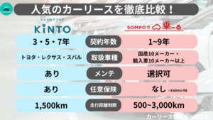 他カーリースだと契約期間で縛られてしまうので、柔軟に途中でのりかえできる選択肢をもっておけるのは重要です。また、トヨタ車を契約するならKINTOが安価な場合が多く、任意保険や正規ディーラーでの充実した質の高いメンテが受けられるのでトヨタ車を他リースを契約するメリットがほぼありません。